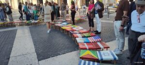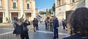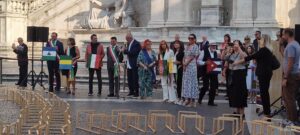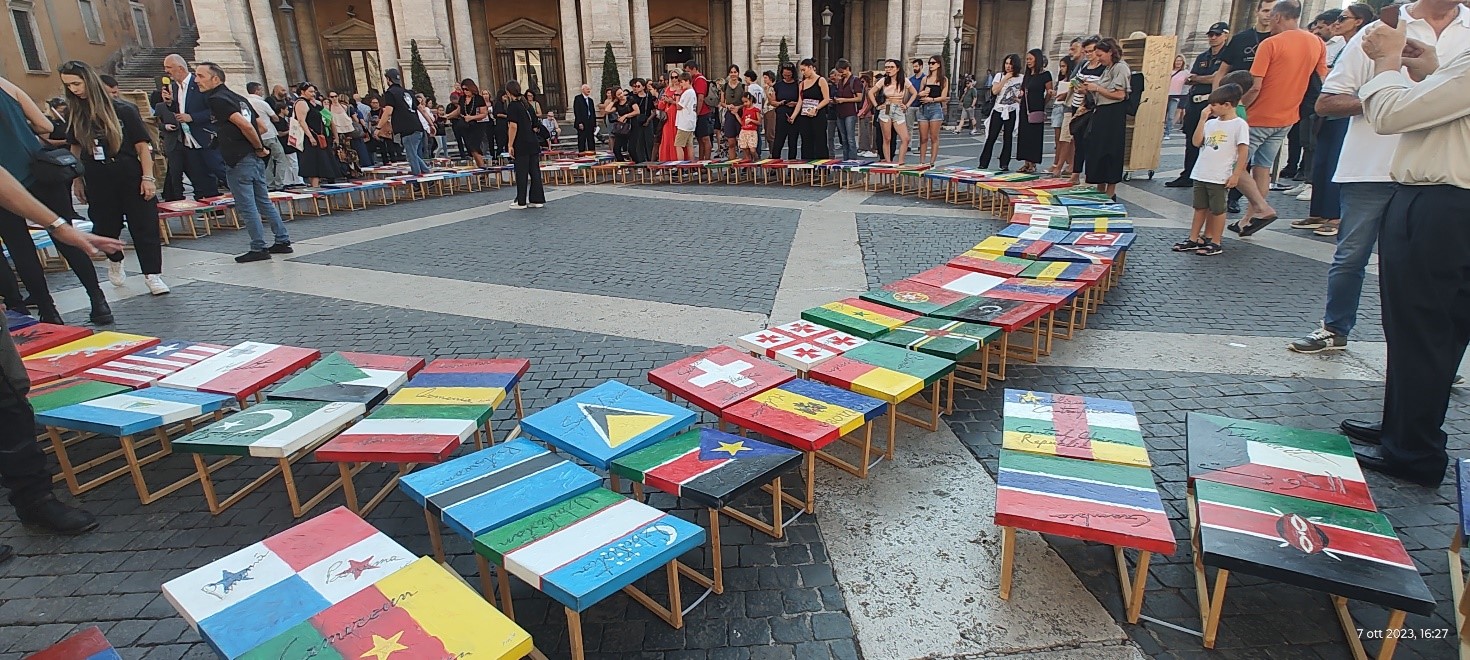 La posa delle 196 tavolette, su cui erano disegnate le bandiere di tutti gli stati aderenti all’ONU, realizzate dagli ideatori del progetto FLAGS, a disegnare il simbolo del Terzo Paradiso sulla piazza del Campidoglio con la partecipazione di tutti i presenti, bambini in prima fila, ha indicato come lo stretto connubio arte, cultura possano unire tutte le diversità favorendo le inclusioni, fondamenti per la democrazia nel mondo. L’agone nuovo è sempre presente e attivo in queste manifestazioni di solidarietà e cultura.