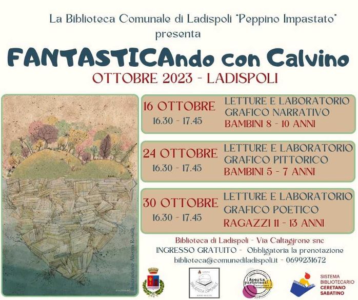 L’amministrazione comunale di Ladispoli ricorda che il 15 ottobre 2023 ricorrono i 100 anni dalla nascita di Italo Calvino: romanziere, scrittore, giornalista, intellettuale di spicco della letteratura italiana tra i più amati anche all’estero. La Biblioteca Comunale Peppino Impastato vuole omaggiarlo dedicando tutto il mese di ottobre alla sua scoperta e conoscenza e, per coinvolgere il pubblico più giovane del territorio, presenta degli incontri suddivisi per fascia d’età, che permetteranno di esplorare l’universo “cosmicomico” di Calvino attraverso le sue molteplici opere.