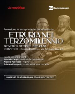 Presentato ieri sera a Cerveteri, presso il Cinema Moderno, il documentario “Etruria nel Terzo Millennio”, lavoro prodotto dalla Vici World Lux srl per la Rai, oggi pomeriggio in onda su RAITRE alle ore 16:00.