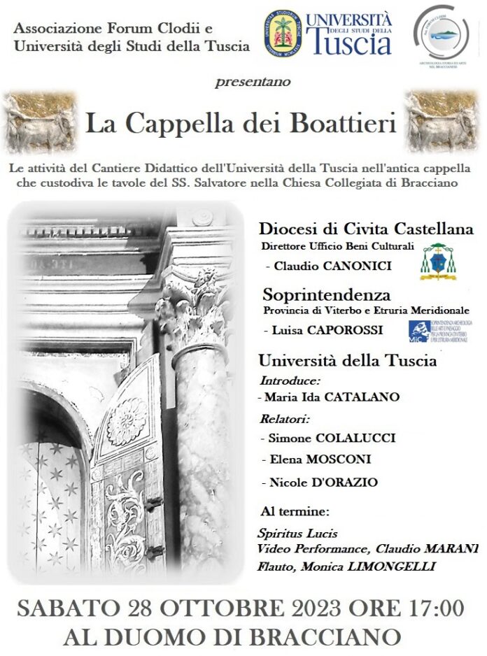 Sabato 28 ottobre alle 17 presso il Duomo di Bracciano, l’Associazione Forum Clodii e l’Università della Tuscia presenteranno la relazione sulle attività del Cantiere Didattico che ha operato, nel corso dell’estate, nell’antica cappella che custodiva originariamente le tavole del SS. Salvatore. Un’iniziativa questa di grande rilevanza che ha coinvolto l’Ufficio Beni Culturali della Diocesi di Civita Castellana, la Soprintendenza per la Provincia di Viterbo e l’Etruria Meridionale e l’Università della Tuscia, con il supporto dell’Associazione Forum Clodii.