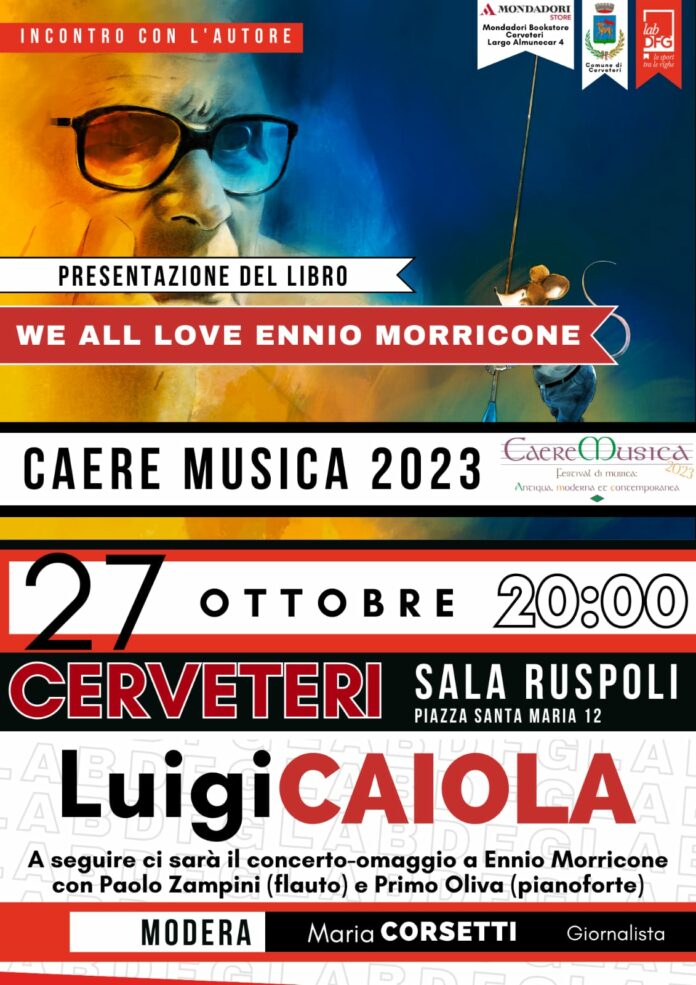 Doppio l’appuntamento in programma nella serata di venerdì 27 ottobre. Alle ore 20:00, all’interno dei locali di Sala Ruspoli, sarà presentato il libro “We all Love Ennio Morricone”, di Luigi Caiola. L’evento è promosso da Mondadori Bookstore di Cerveteri. L’incontro con l’autore, sarà moderato dalla giornalista Maria Corsetti.