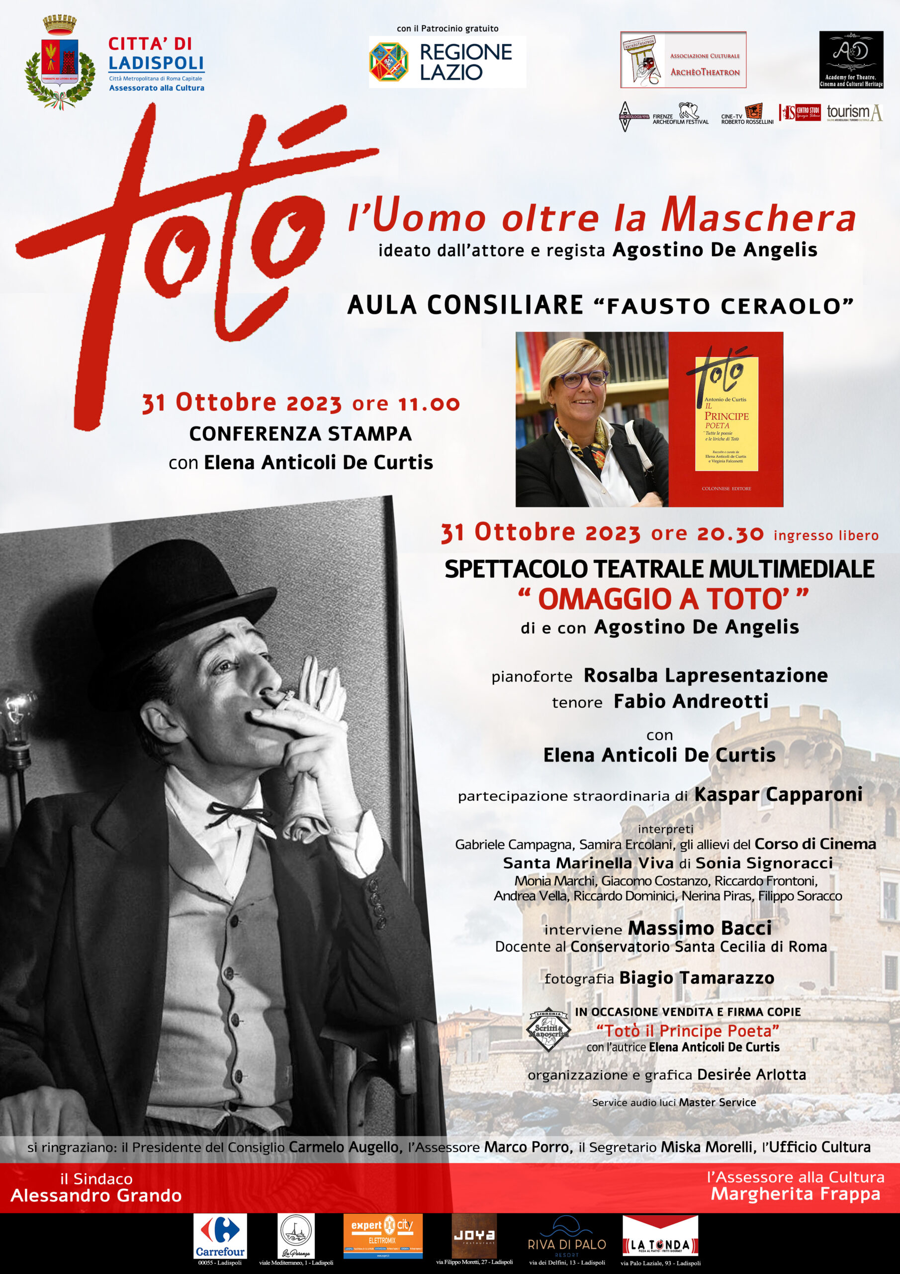 “Totò, l’Uomo oltre la maschera” è il titolo dello Spettacolo Teatrale Multimediale ideato dall’attore e regista Agostino De Angelis, promosso dal Comune di Ladispoli, Assessorato alla Cultura e voluto fortemente dal Sindaco Alessandro Grando, patrocinato dalla Regione Lazio e organizzato dall’Associazione Culturale ArchéoTheatron e dall’Academy for Theatre, Cinema and Cultural Heritage.