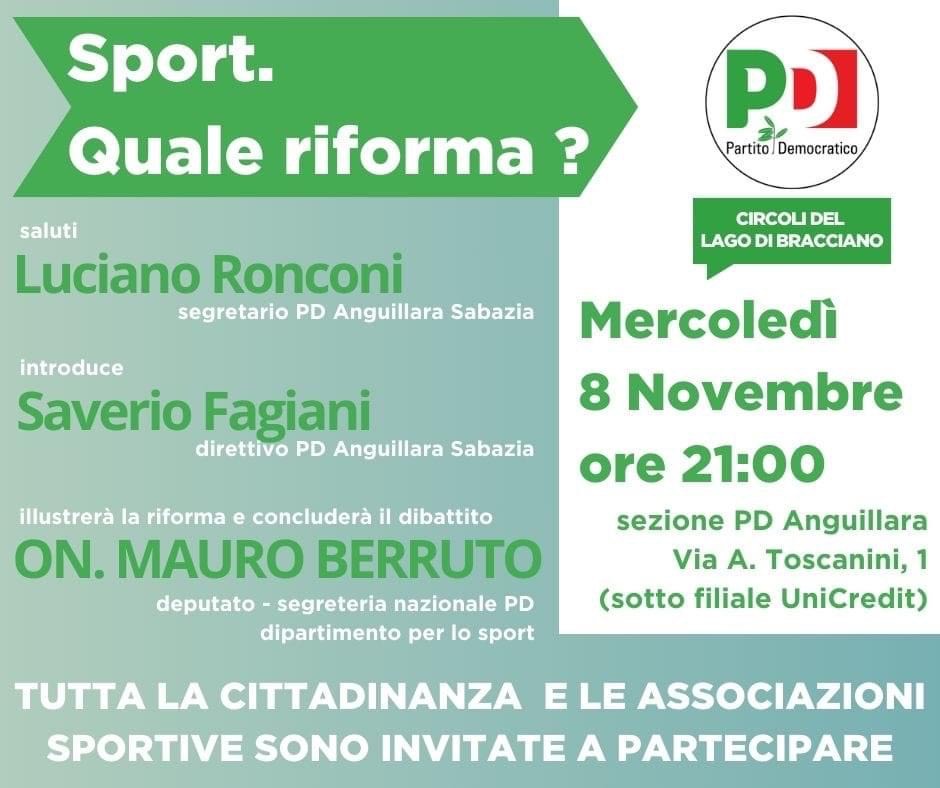 “Sport. Quale riforma? Il settore dello sport è investito da una profonda Riforma. Il progetto messo in campo dal governo cambierà radicalmente la vita di moltissime realtà e solleva molte perplessità. Il Partito Democratico di Anguillara Sabazia ha dunque deciso di organizzare un momento di confronto sui punti critici della riforma con l’on. Mauro Berruto, già commissario tecnico della nazionale di pallavolo maschile italiana, poi direttore tecnico della nazionale italiana di tiro con l’arco e membro della segreteria nazionale del Partito Democratico, con delega allo sport. L’incontro si terrà alle ore 21 dell’8 Novembre presso la sezione del PD di Anguillara per incontrare e ragionare con le ASD del lago di Bracciano per capire insieme e meglio i cambiamenti che la riforma introdurrà. Ovviamente però la più ampia partecipazione è auspicabile perché lo sport è settore nevralgico per una società aperta e sana, quindi l’invito è esteso a tutti gli interessati”