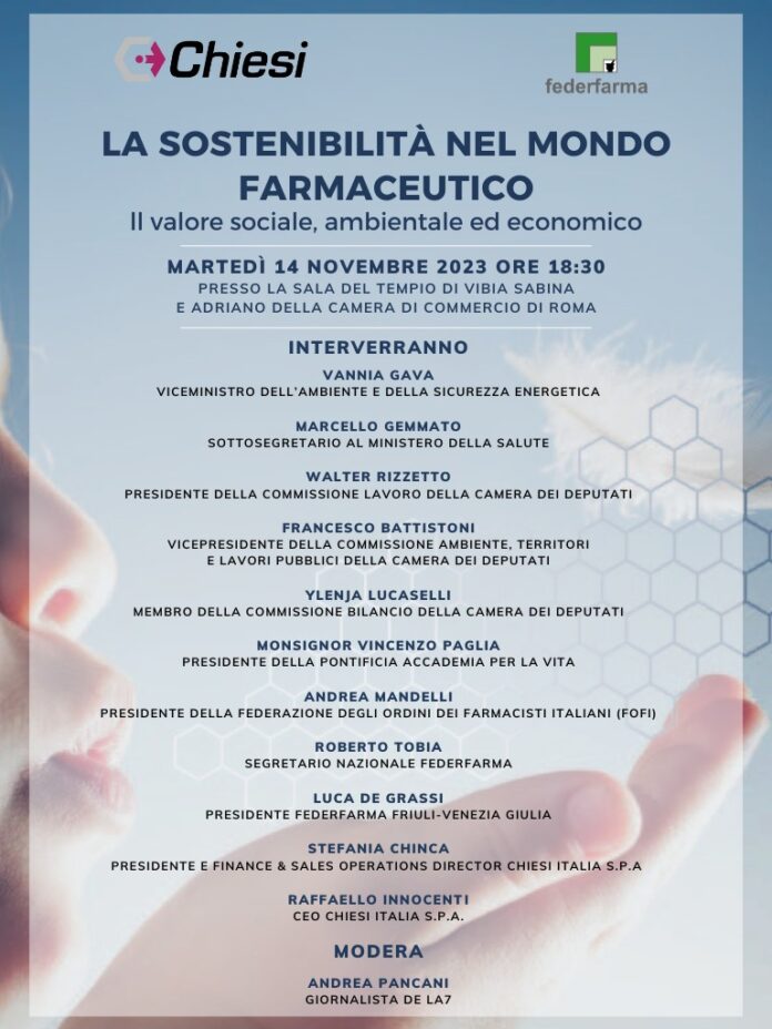 Martedì 14 novembre, alle ore 18.30, presso la Sala del Tempio di Vibia Sabina e Adriano della Camera di Commercio di Roma, si terrà il convegno “La Sostenibilità nel mondo farmaceutico. Il valore sociale, ambientale ed economico”, promosso da Chiesi Italia e Federfarma. Al centro del dibattito il grande processo di trasformazione che caratterizza sempre di più il ruolo della farmacia e del farmacista, il tema della sostenibilità nelle sue diverse direttrici, sociale, economica e ambientale, e l’importanza degli investimenti in innovazione farmaceutica. Nel corso dell’evento verranno presentati i tre progetti realizzati da Chiesi Italia: Sentiero del respiro, Recupera e Respira, Farmacia sostenibile.
