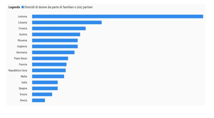 I dati si riferiscono al numero di omicidi volontari con vittime di sesso femminile commessi da familiari o (ex) partner, in rapporto alla popolazione femminile totale. Non sono disponibili i dati di 12 dei 27 paesi dell’Ue: Cipro, Estonia, Belgio, Irlanda, Portogallo, Danimarca, Finlandia, Slovacchia, Polonia, Bulgaria, Lussemburgo e Romania.