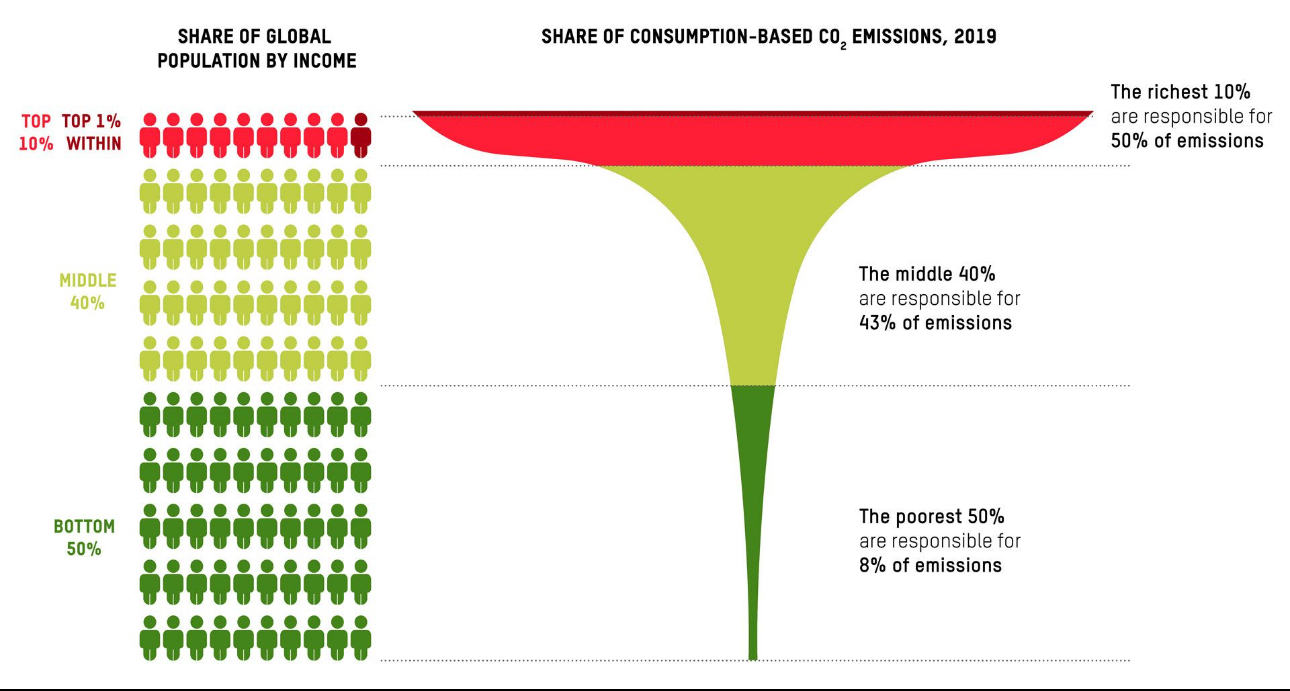 Il 2019 ha visto l’1% più ricco della popolazione mondiale contribuire al 16% delle emissioni globali di anidride carbonica derivanti dai consumi. Con soli 77 milioni di persone, questo gruppo elitario ha inquinato quanto i due terzi più poveri del nostro pianeta, una cifra impressionante che coinvolge ben 5 miliardi di individui.