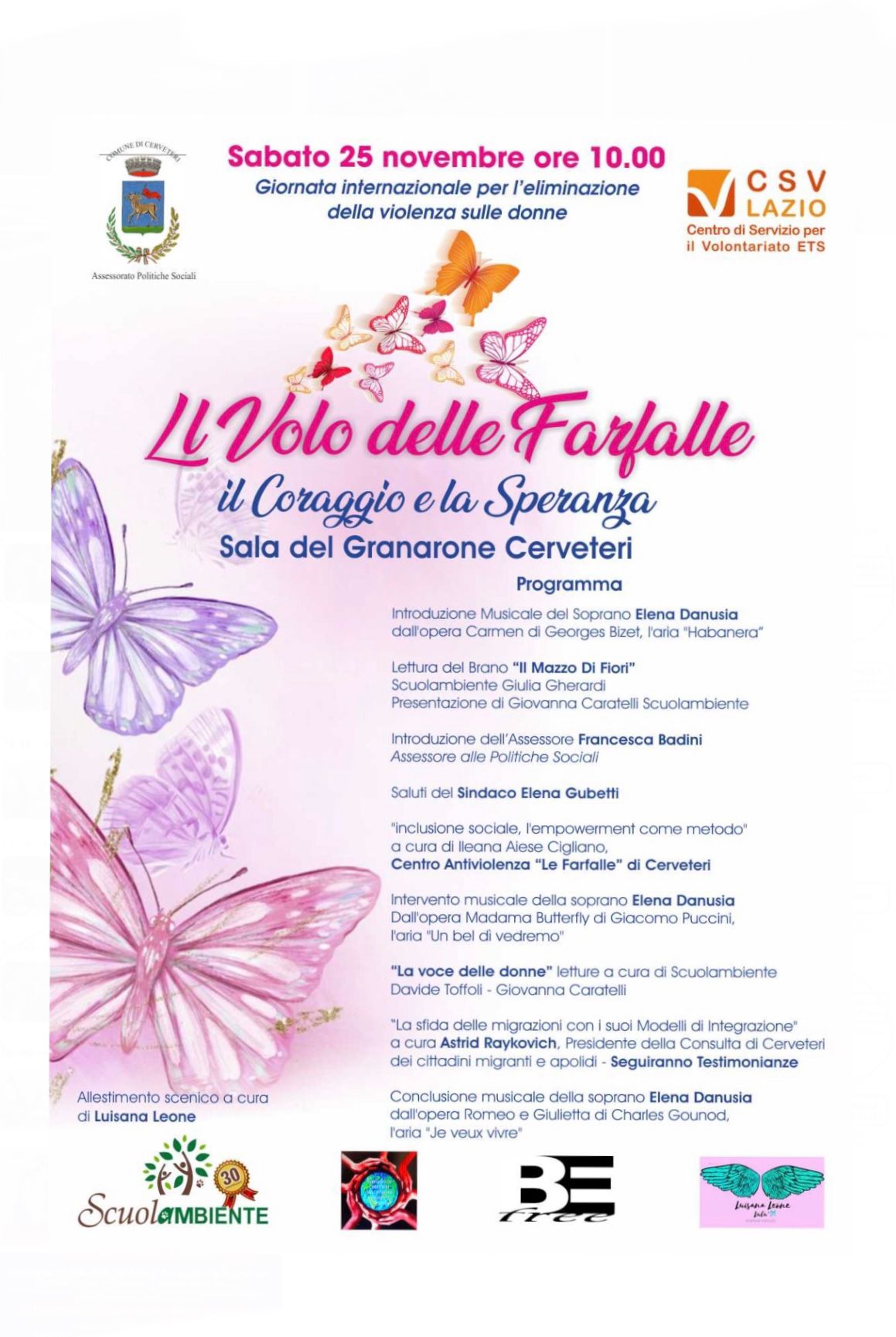 “Il Volo delle farfalle, il coraggio e la speranza”. È questo il titolo del convegno che Francesca Badini, Assessore alle Politiche Sociali del Comune di Cerveteri, insieme alla Cooperativa BeFree, e in collaborazione con il Centro di Servizio per il Volontariato ETS, Scuolambiente, la Consulta dei Cittadini Migranti e Apolidi e l’artista Luisana Leone, ha organizzato per sabato 25 Novembre alle ore 10:00 presso l’Aula Consiliare del Granarone, in occasione della Giornata Internazionale per l’Eliminazione della Violenza contro le Donne.