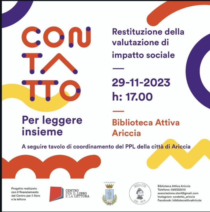 Ci sarà mercoledì 29 Novembre alle ore 17.00, presso la Biblioteca Attiva, l’evento “Ariccia città che legge”. Il progetto “Con-tatto per leggere insieme” ha permesso alla Biblioteca Attiva di avviare un percorso di accessibilità alla lettura per tutti i membri della comunità, a partire dai più fragili diventando un punto di riferimento per il territorio per quanto riguarda la lettura inclusiva. Una città che legge si impegna a tutto tondo per fare in modo che l’intera comunità sia partecipe e attiva nella diffusione della lettura come valore riconosciuto e condiviso, in grado di influenzare positivamente la qualità della vita individuale e collettiva. Biblioteche, musei, associazioni, realtà culturali, sportive, commerciali, imprenditoriali possono e sono chiamate, insieme, a far entrare il libro e la lettura in ogni ambito della vita quotidiana. Il comune di Ariccia si è dotato del Patto per la Lettura come strumento di co-progettazione e diffusione delle buone pratiche per crescere, insieme, comunità che legge.