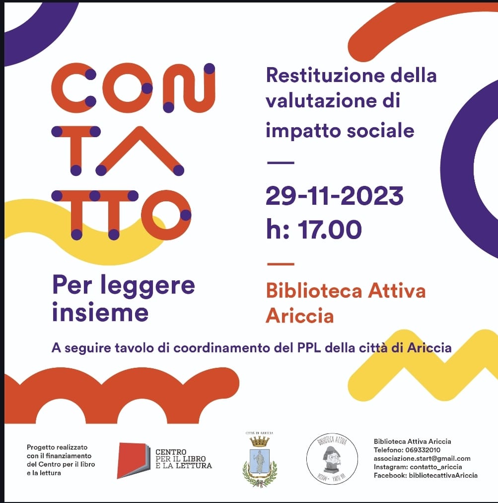 Il programma prevede un convegno sulla restituzione dell’impatto sociale del progetto Con-tatto: per leggere insieme a cura del dott. Emiliano Dionisi con il Cepell (Centro per il libro e la lettura) e i rappresentanti dei partner del progetto. Seguirà la presentazione delle proposte del Comune di Ariccia per il bookcrossing, la presentazione dei gruppi di lettura della Biblioteca Attiva e della lettura condivisa come buona pratica da incentivare. A sovrintendere l’incontro ci saranno il Sindaco di Ariccia Gianluca Staccoli, la consigliera nonché promotrice dell’iniziativa Anita Luciano, la consigliera Irene Falcone, il dirigente dell’area cultura dott. Claudio Fortini; parteciperà anche l’Assessore ai Servizi Sociali l’avvocato Loredana Mariani. Inoltre, ci sarà la consegna al Sindaco dei messaggi dal bosco di Parco Chigi dei ragazzi e delle ragazze dell’I.C. Vito Volterra.