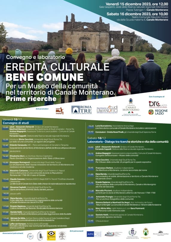 Nell’anno del 150° anniversario della denominazione Canale Monterano il 15 e 16 dicembre cittadini e interessati sono invitati al convegno-laboratorio ‘Eredità culturale bene comune’.