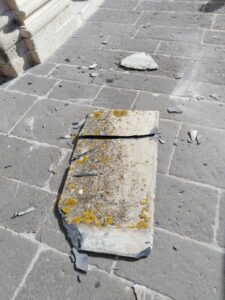 Proprio poco dopo le 10.30, quando da pochi minuti i portoni erano stati aperti ai visitatori dai volontari del Museo, alcune consistenti lastre di peperino sono volate via dal tetto.