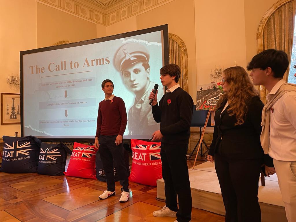 Il 26 ottobre in occasione del “Remembrance day”, giorno della memoria a commemorazione della fine della prima Guerra Mondiale e dei caduti di tutte le guerre, che si celebra l’11 novembre in molti Paesi del Commonwealth e in alcuni Stati europei, gli studenti del “Vian” (Serena, Ludovico e Federico della 5N e Manlio della 5L), accompagnati dalla dirigente Lucia Lolli e dalla vicepreside Cristina Carosi, hanno avuto il piacere di essere ospiti a Villa Wolkonsky a Roma, residenza ufficiale dell’ambasciatore britannico Mr. Edward Llewellyn in Italia, per presentare in lingua inglese il nostro progetto riguardante questa importante giornata: la vita di Ignazio Vian, il militare e partigiano italiano che dà il nome alla scuola. Appena entrati a villa Wolkonsky I ragazzi sono stati accolti dallo staff dell’organizzazione della giornata, e hanno indossato una spilla a forma di papavero rosso, simbolo del “Remembrance day”, come segno di rispetto e solidarietà; il papavero rosso infatti fu scelto come emblema perché cresceva nei campi di battaglia delle Fiandre, dove morirono migliaia di soldati. Durante la giornata sono stati osservati due minuti di silenzio. È stato un momento molto emozionante e commovente, che ha fatto riflettere sul valore della pace, della libertà e della solidarietà tra i popoli. I ragazzi si sono sentiti molto orgogliosi e commossi nel parlare di Ignazio Vian, eroe della Resistenza italiana, che combatté contro i nazisti nella zona di Boves, a Torino, dove fu impiccato dai tedeschi nel luglio del 1944; figura ispiratrice, che rappresenta i migliori valori del popolo italiano e dello spirito europeo. Gli studenti sono molto grati agli insegnanti e alla dirigente per aver avuto questa opportunità. Al termine della presentazione gli studenti hanno ricevuto molti complimenti dagli astanti, che hanno apprezzato il loro intervento. Pensiamo, infatti, di aver raggiunto gli obiettivi del nostro lavoro, che erano quelli di onorare la memoria di Ignazio Vian, di informare il pubblico sul suo importante ruolo nella Resistenza e di favorire la comprensione reciproca e l’amicizia tra Italia e Regno Unito.