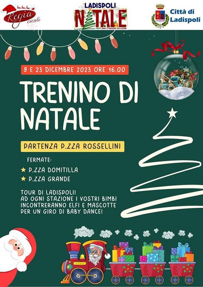 Sabato 9 e sabato 23 dicembre alle ore 16 un appuntamento col Trenino di Natale. Con partenza da piazza Rossellini un tour di Ladispoli dove ad ogni fermata i più piccini incontreranno elfi e mascotte per un giro di baby dance.
