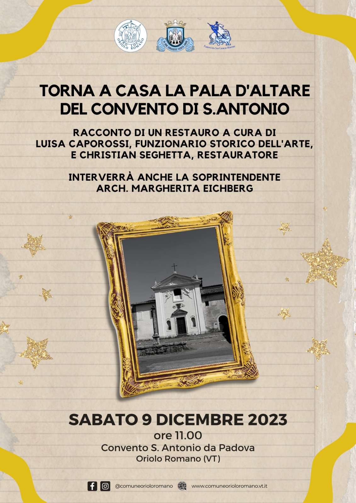 Sabato 9 alle 11 presso il Convento di Sant’Antonio da Padova, con gli interventi della Dottoressa Luisa Caporossi, funzionaria storica dell’arte, e del Dottore Christian Seghetta, restauratore, si presenta ufficialmente il restauro della pala d’altare della Chiesa del Convento, recentemente riposizionata nella sua sede dopo alcuni mesi di assenza per le operazioni di restauro.