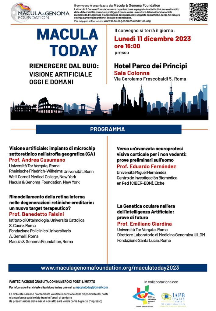 Lunedì 11 dicembre 2023, alle ore 16, si terrà a Roma, presso l’Hotel Parco dei Principi (Sala Colonna), la nuova edizione del Macula Today. Si tratta del convegno internazionale annuale organizzato dalla Macula & Genoma Foundation, Fondazione no profit presieduta dal Prof. Andrea Cusumano, in collaborazione con l’Unione Italiana dei Ciechi e degli Ipovedenti ETS e con la IAPB ITALIA Consiglio Regionale del Lazio.