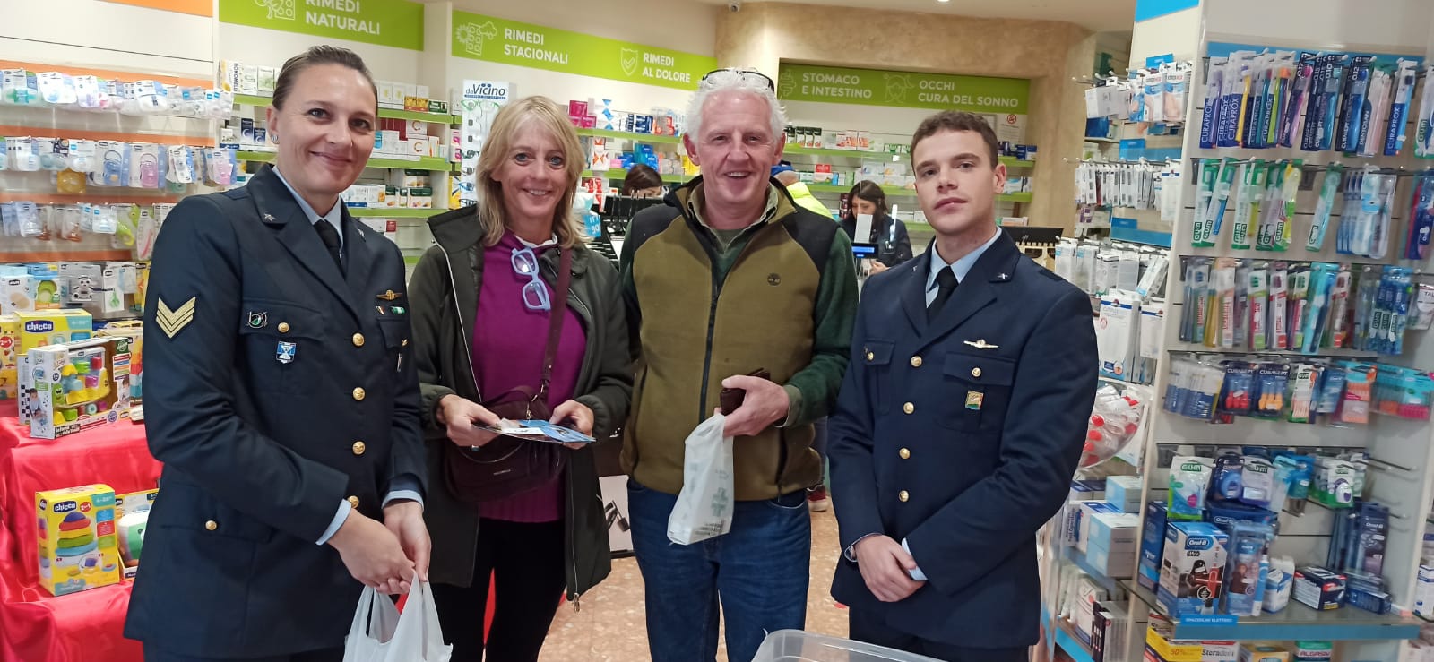 Viva soddisfazione anche da parte del personale della Farmacia: “In questo percorso di sensibilizzazione verso l’utenza ci hanno accompagnato e sostenuto i militari del Centro Storiografico e Sportivo e del Centro Tecnico per la Meteorologia dell’Aeronautica Militare di Vigna di Valle e i soci dell’ANMI. La loro presenza ha permesso che l’evento fosse “raccontato” alle persone che entravano in farmacia. I volontari hanno accolto con delicatezza le persone e, senza risparmiarsi, hanno illustrato il progetto e il suo fine. Vi ringraziamo per l’impegno e lo spirito umanitario con cui vi siete donati a questa iniziativa. Quest’anno il devoluto ha superato di molto quello dello scorso anno”.
