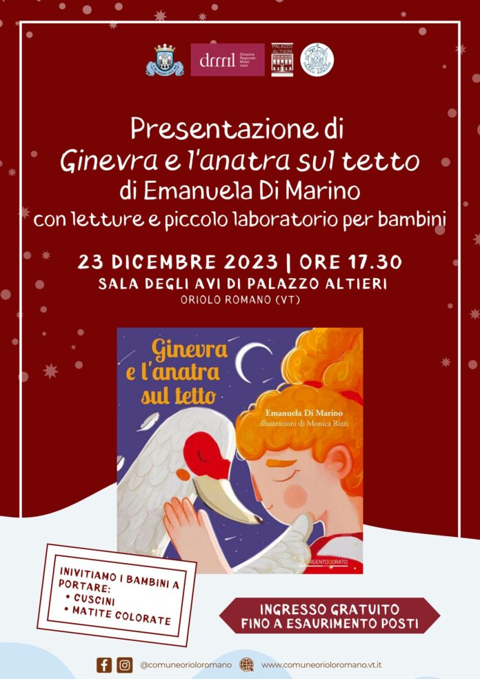 Riceviamo e pubblichiamo – Appuntamento sabato 23 dicembre 2023 alle ore 17.30 presso Palazzo Altieri con la presentazione di “Ginevra e l’anatra sul tetto” di Emanuela Di Marino.