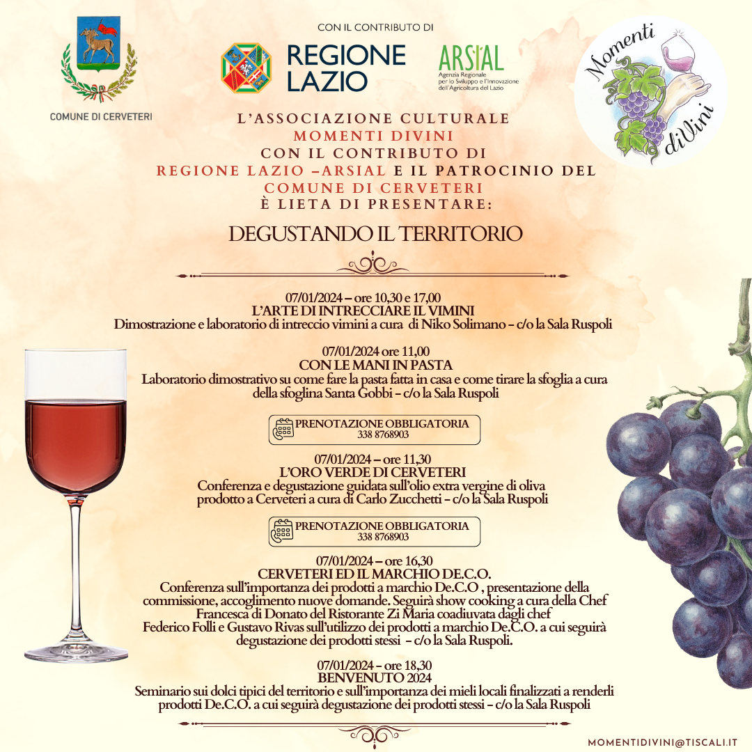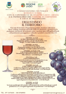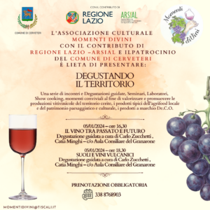 L’Associazione Culturale MOMENTI DIVINI con il contributo di Regione Lazio – Arsial e con il patrocinio del Comune di Cerveteri, è lieta di presentare una serie di incontri e degustazioni guidate, seminari, laboratori, show coking, momenti conviviali al fine di valorizzare e promuovere le produzioni vitivinicole del territorio cerite, i prodotti dell’agrifood locale e del patrimonio paesaggistico e culturale, i prodotti a marchio De.C.O.