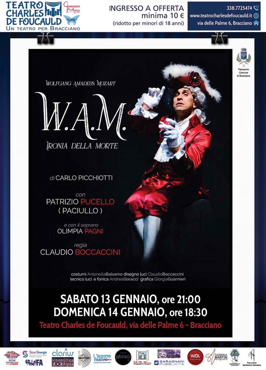 Sabato 13 gennaio ore 21.00 e domenica 14 gennaio ore 18.30: “W.A.M. Ironia della morte”, uno spettacolo su Mozart che approfondisce il suo rapporto con l’arte e con la sua vita. Un Patrizio Paciullo inedito e perfettamente calato nel personaggio, interpreta magistralmente il testo di Carlo Picchiotti con la regia di Claudio Boccaccini. Avremo la possibilità di ascoltare il soprano Olimpia Pagni, bravissima ed apprezzata interprete, che impreziosisce lo spettacolo con la sua performance canora.