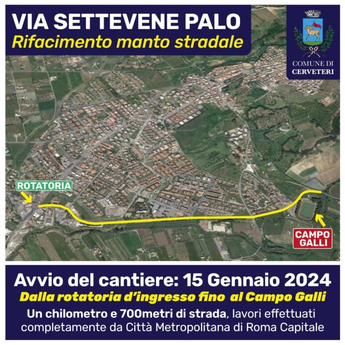 “Lunedì 15 gennaio inizierà un cantiere importantissimo per Cerveteri. Inizieranno infatti i lavori di riasfaltatura totale di Via Settevene Palo Nuova, nel tratto di strada che parte dalla rotatoria all’ingresso della città fino all’incrocio con il Campo Enrico Galli. Lavori che saranno effettuati da Città Metropolitana di Roma Capitale. Un chilometro e 700metri di strada, che verranno messi totalmente a nuovo: un lavoro fondamentale che metterà in sicurezza una arteria stradale a grande scorrimento, che collega due aree estremamente popolose della nostra città e sulla quale ogni giorno transitano migliaia di automobili, mezzi del trasporto pubblico, mezzi pesanti e mezzi di soccorso”. A dichiararlo è Elena Gubetti, Sindaco di Cerveteri.