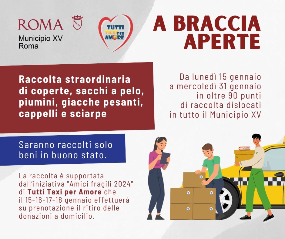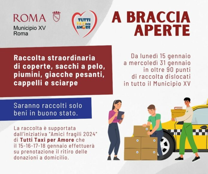 “Al via la terza edizione di “A Braccia Aperte”, l’iniziativa di solidarietà del Municipio XV per la raccolta di coperte e vestiario invernale per i senza fissa dimora e le persone fragili di Roma Nord e di tutta la città.