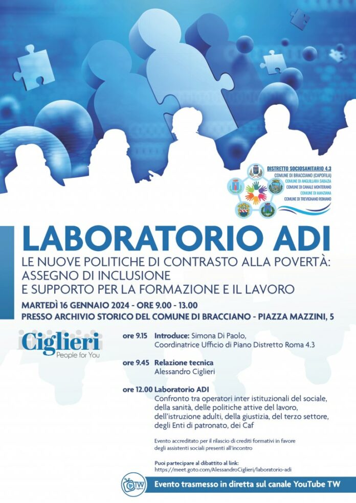 Per la migliore attuazione della misura sul nostro territorio, è stata organizzata una giornata info/formativa denominata “Laboratorio ADI” che si terrà il giorno 16 gennaio dalle ore 9.00 presso l’Archivio Storico del Comune di Bracciano, Piazza Mazzini, 5.