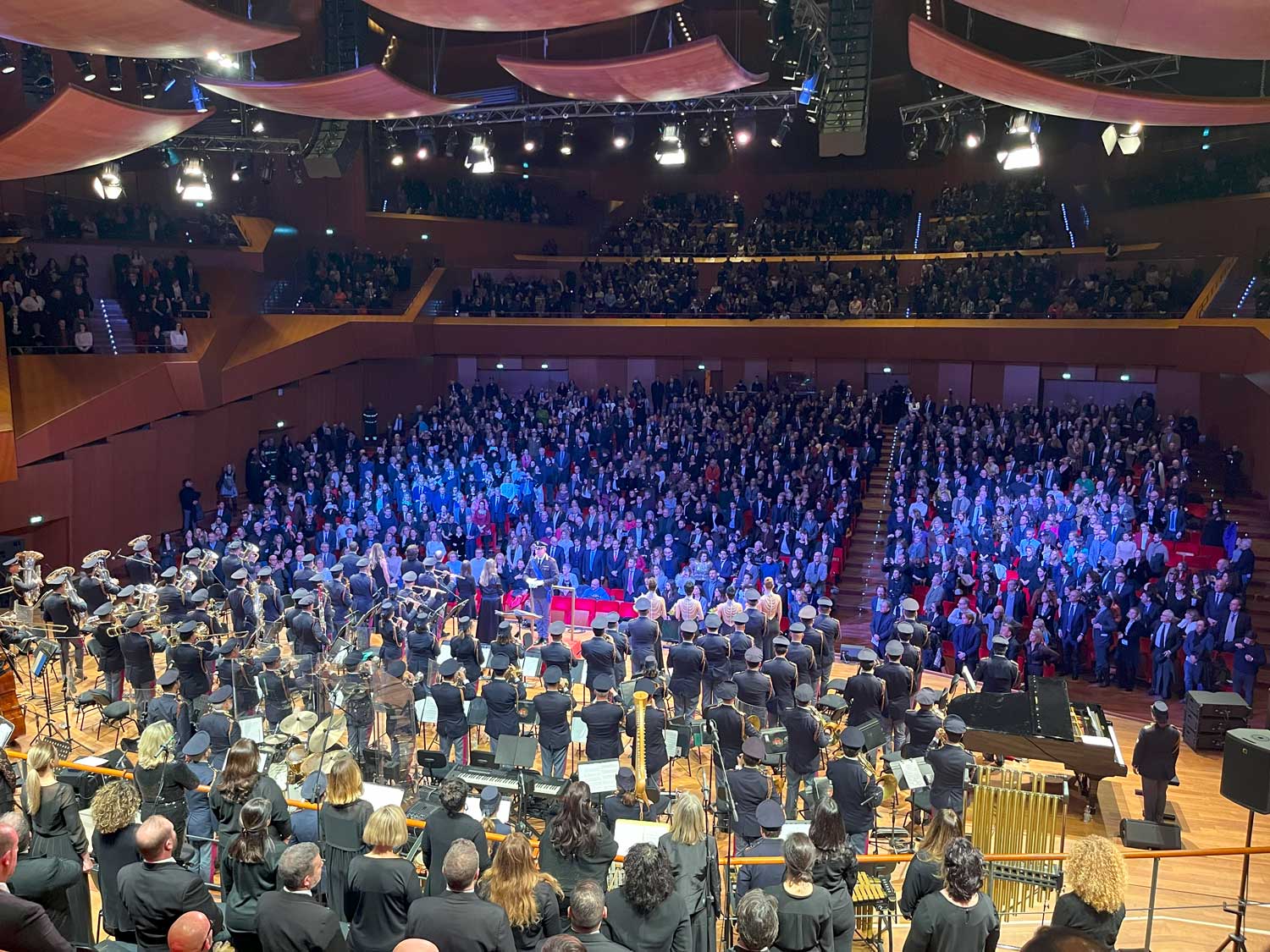 La kermesse, presentata egregiamente da Carlo Conti con la partecipazione di Annalisa Manduca, ha visto l’esibizione di numerosi artisti, accompagnati dalla Banda della Polizia di Stato, diretta dal Maestro Maurizio Billi e dal Coro dell’Accademia Nazionale di Santa Cecilia diretto dal maestro Andrea Secchi. Loro l’apertura di serata con emozionanti brani di Ennio Moriconi – eseguiti in modo eccelso – alcuni dei quali con la voce delle soprano del quartetto vocale Le Div4s – Italian Sopranos, seguiti da Gigi d’Alessio al pianoforte che ha regalato tre brani ai presenti e, tra scherzose battute calcistiche con Carlo Conti (Napoli vs Fiorentina) ha fatto calorosi ringraziamenti dicendo: “ringraziamo chi ci cura e chi ci difende” (medici e polizia presenti); in particolar modo ha ringraziato il prof. Giovanni Scambia medico chirurgo direttore scientifico e presidente del comitato esecutivo della Fondazione “Policlinico Universitario Agostino Gemelli IRCCS” del quale è anche direttore del Dipartimento Scienze della Salute della Donna e del Bambino. Ci sono stati momenti in cui l’energia della commozione aleggiava nella sala durante la serata, questo uno di quelli.