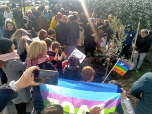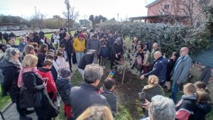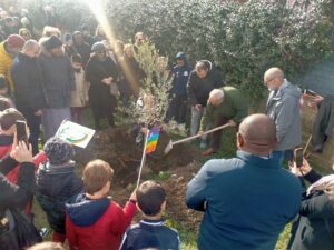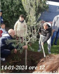 Alla presenza del Sindaco avv.to Angelo Pizzigallo  nonchè di un folto numero di  cittadine e cittadini, tra i quali molti bambini, si è piantato un albero di ulivo in un giardino pubblico messo a disposizione dalla Amministrazione Comunale; alla base dell’albero – illuminato da un raggio di sole – è stata posta una targa con la scritta della parola PACE in molte lingue.