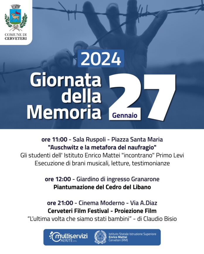 Il programma delle iniziative comincia alle ore 11:00 in Sala Ruspoli, con un’iniziativa organizzata dai ragazzi dell’Istituto Enrico Mattei di Cerveteri. “Auschwitz e la metafora del naufragio”, un momento fatto di brani musicali, letture e testimonianze. A seguire, alle ore 12:00, al giardino di ingresso del Granarone seguirà la piantumazione di un Cedro del Libano, pianta che vuole simboleggiare e lanciare un forte messaggio di pace, unità e fratellanza, valori più che mai fondamentali nella società odierna, caratterizzata ancora da forti contrasti sociali a livello internazionale.