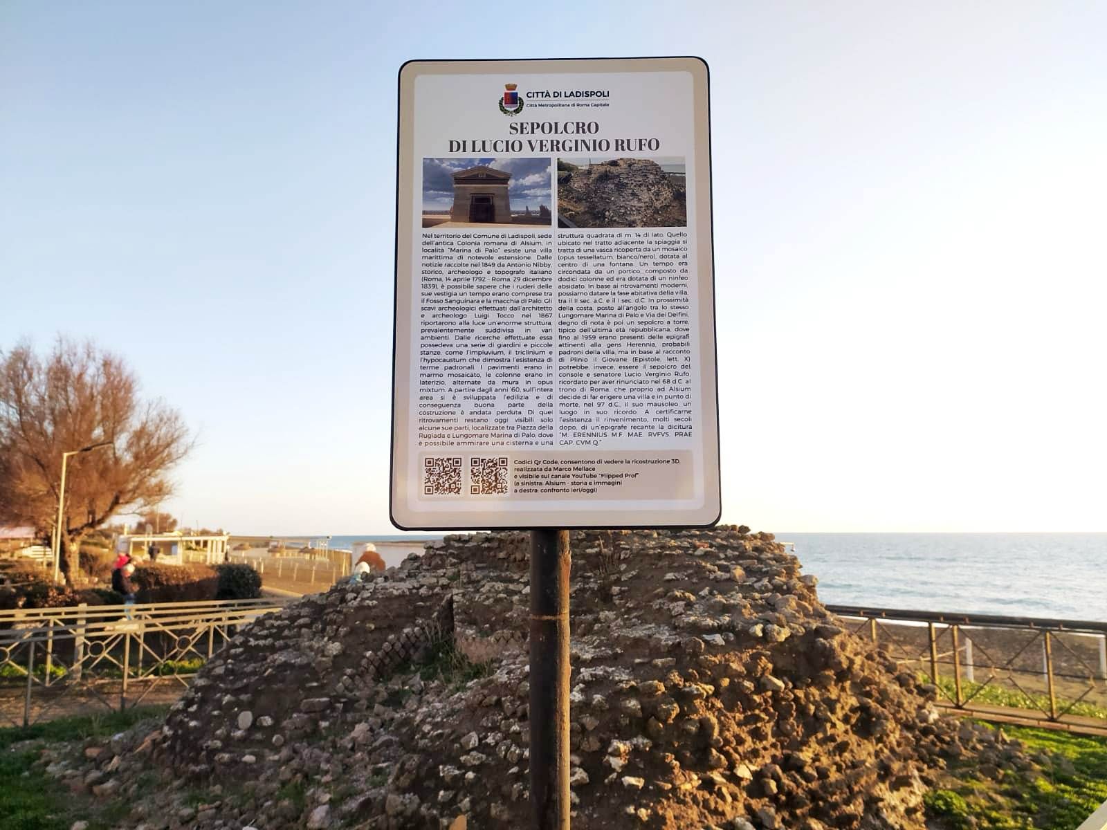 “I luoghi interessati dagli interventi – ha proseguito l’Assessore – sono quelli del centro urbano, come i ruderi della villa imperiale rurale della Grottaccia, di Via Rapallo e i resti della grande villa, sempre di epoca romana, posti tra Piazza della Rugiada, il mosaico di Lungomare Marina di Palo e il sepolcro, attribuito da alcuni storici al console e militare romano Lucio Verginio Rufo, ubicato nello stesso lungomare angolo con Via dei Delfini. La nuova cartellonistica contiene al suo interno immagine di confronto ieri (ricostruzione in 3D) e oggi, descrizione del luogo e Codici QR Code che rimandano alle relative ricostruzioni in tre dimensioni effettuate da Marco Mellace, visibili sul suo Canale YouTube “Flipped Prof”, che l’Amministrazione Comunale del Sindaco Alessandro Grando, partendo dalla sottoscritta, ringraziano per la disponibilità concessa, permettendo così all’iniziativa di poter aggiungere un’ulteriore servizio di conoscenza per la cittadinanza”.