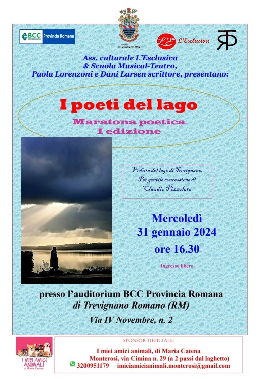 Mercoledì 31 gennaio alle ore 16.30, presso l’auditorium della BCC di Trevignano Romano, appuntamento letterario con la maratona poetica denominata “I poeti del lago”, evento culturale organizzato dall’associazione L’Esclusiva & Scuola Musical-Teatro di Paola Lorenzoni, in collaborazione con lo scrittore e presentatore Daniele Limongelli, in arte Dani Larsen. La manifestazione vedrà alcuni poeti di Trevignano e dei paesi limitrofi decantare i propri versi. La prima parte è dedicata alle donne, tra gli ospiti: Sonia Succi, Annamaria Marrone, Arianna Mosconi, Giuseppina Dibitonto e Eleonora Raimondi. Nella seconda parte dello spettacolo, parola agli uomini con il fotografo Claudio Pizzolato e i poeti Costantino Liquori, Nando Morichelli e i fratelli Zinzi. Il servizio fotografico sarà affidato al giovane youtuber Giovanni Limongelli. Si ringrazia la signora Maria Catena di Monterosi per la sponsorizzazione.
