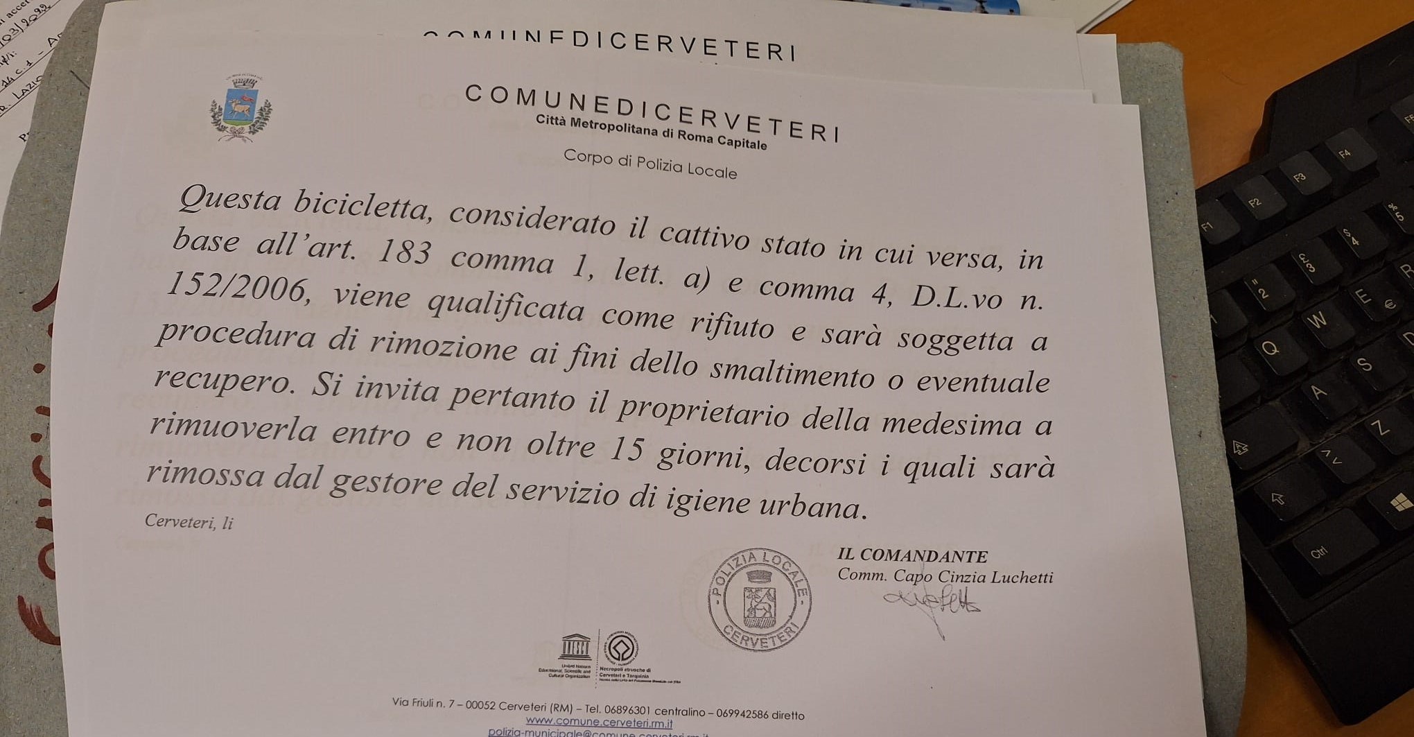 “Quello dell’abbandono delle biciclette è un problema purtroppo diffuso in tutto il territorio ed in particolar modo nelle zone di Cerveteri capoluogo e nella frazione di Marina di Cerveteri – ha dichiarato il Sindaco di Cerveteri Elena Gubetti – un elemento che porta solamente degrado: nei quotidiani pattugliamenti nel territorio, la Polizia Locale ha rinvenuto moltissime biciclette oramai degradate dagli agenti atmosferici e dallo stato di abbandono. Le biciclette rimosse saranno qualificate come rifiuto e inviate a smaltimento o eventualmente a recupero quando possibile”.