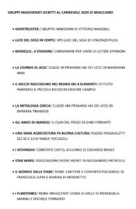 Hanno sfilato 12 gruppi di mascherate, 275 persone vestiti a tema, il carro dei Flinstones e di Star Wars, il carretto del Mondo delle Fiabe e di Re Carnevale, la Banda di Molfetta, il gruppo Makeman, l’associazione Aps Luce del Sole, l’associazione Camminare per unire, il Clan del Frigo, il comitato di Castel Giuliano, il comitato di Pisciarelli, il rione Vigna di Valle , il rione Monte ed il rione Cartiere, l’istituto paritario di bracciano il piccolo riccio della cooperativa sociale gialla ed i bambini ed insegnanti del plesso scolastico di via dei Lecci e Pasqualetti di Bracciano.