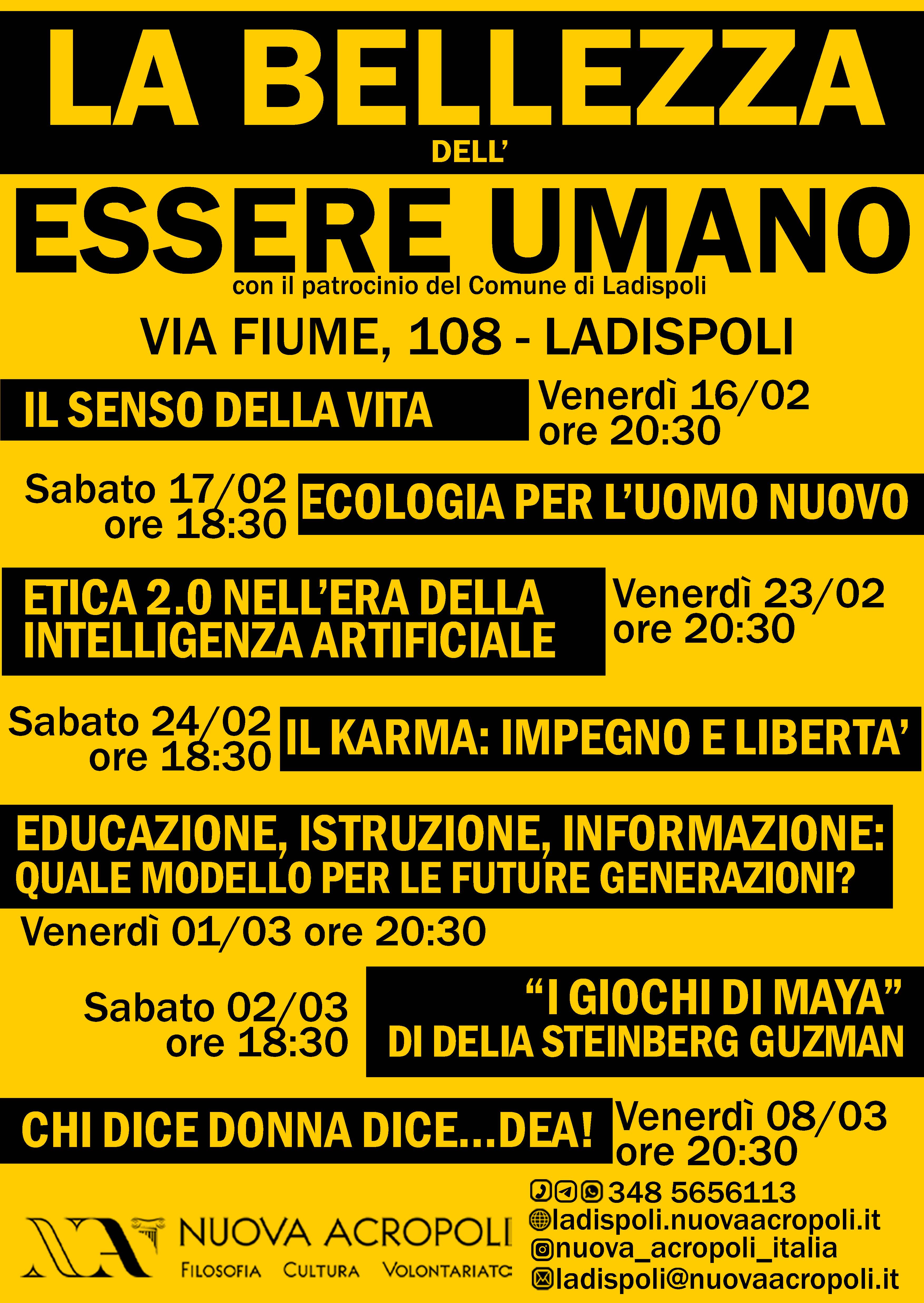 Si inizia venerdì 16 febbraio con “Il senso della Vita” e sabato 17 con “Ecologia per l’Uomo Nuovo”. Venerdì 23/02 è la volta di “Etica 2.0 nell’era dell’intelligenza artificiale”, mentre sabato 24 si parlerà di “Karma: impegno e libertà”. Venerdì 01/03 si parlerà di “Educazione, istruzione, informazione: quale modello per le future generazioni?”, per proseguire sabato 02/03 con la presentazione del libro di Delia Steinberg Gùzman “I giochi di Maya”. Chiude il ciclo, proprio nella Giornata Internazionale della Donna, la conferenza “Chi dice donna dice…Dea!”.