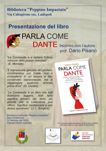 L’amministrazione comunale informa che giovedì 22 febbraio alle ore 16:00 la Biblioteca ha organizzato presentazione del libro Parla come Dante di Dario Pisano. L’autore in questa opera ci spiega l’origine dantesca di molte espressioni che tutti noi usiamo di frequente nella vita quotidiana.