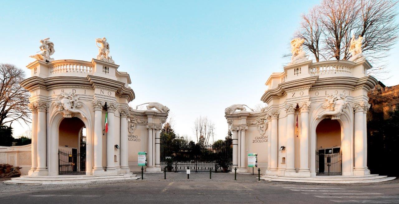 Il monumentale ingresso al Giardino Zoologico venne realizzato a partire dal 1909 su disegno di Armando Brasini (1879-1965), architetto e urbanista italiano tra i più noti dei primi del Novecento, e Giulio Barluzzi (1878-1953) architetto ed ingegnere. Venne poi inaugurato, insieme all’intero complesso dello Zoo, il 5 gennaio del 1911, nell’ambito delle iniziative dell’Esposizione Internazionale per il cinquantenario dell’Unità d’Italia.