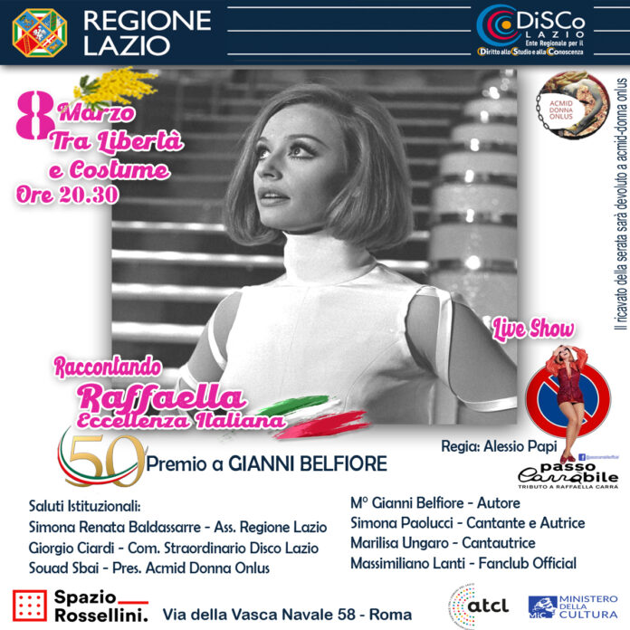 Diversi, nel corso dell’evento, saranno le testimonianze, i contributi visual, le esposizioni e i ricordi di tutto l’ineguagliabile entourage che ha ruotato attorno ad un’artista di spessore come la nostra amata Raffaella.