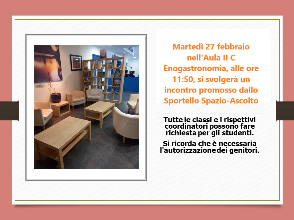 Si ricorda che per accedere allo Spazio-Ascolto basta una segnalazione da parte dei Coordinatori dei Consigli di Classe che dopo un’attenta e condivisa valutazione delle situazioni e dei contesti specifici, potranno rivolgersi direttamente alle Referenti della Commissione per concordare le modalità di partecipazione degli studenti, in base alla loro eventuale e volontaria richiesta.