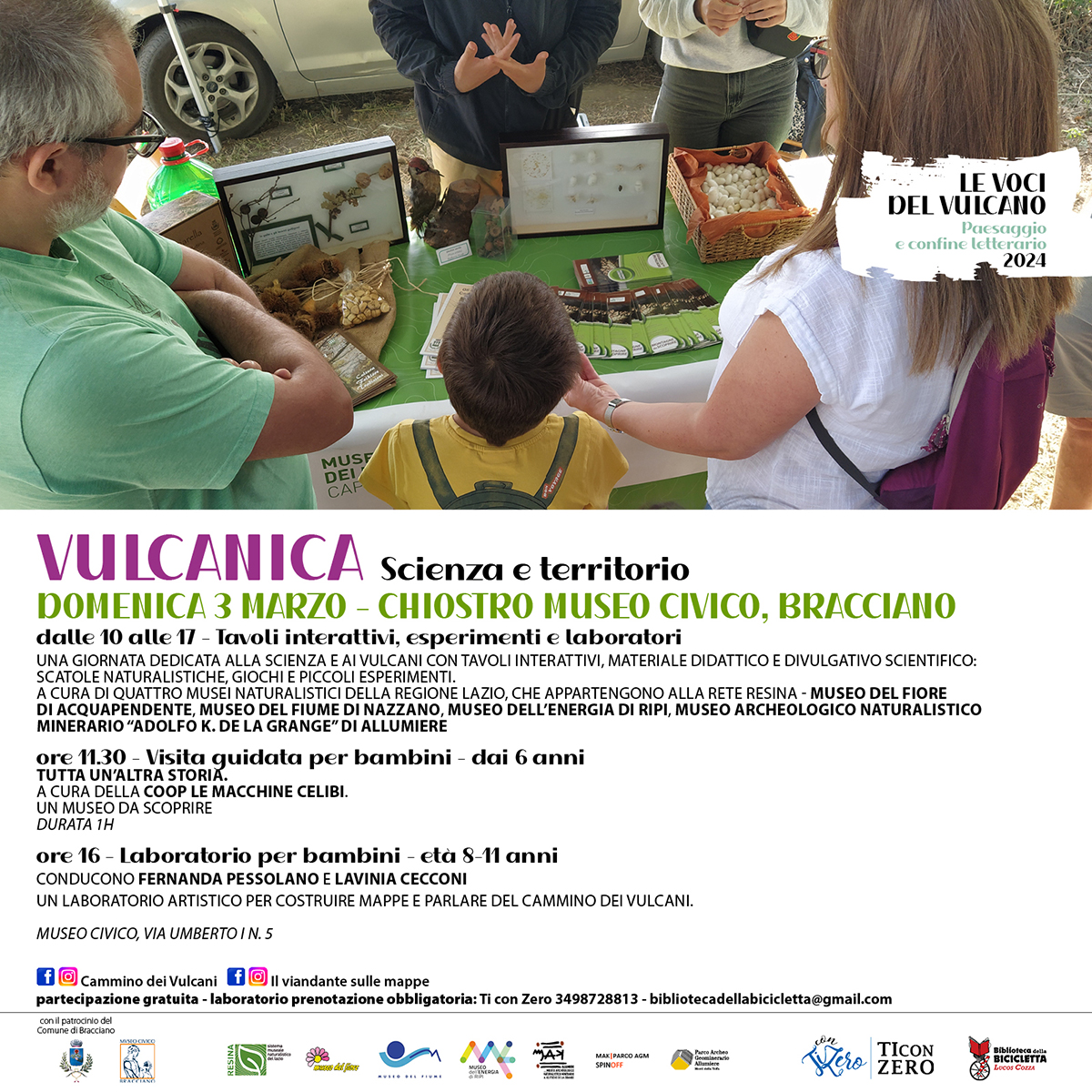 “Le voci del vulcano. Paesaggio e confine letterario” è un progetto di Fernanda Pessolano/Ti con Zero interdisciplinare che intende favorire il dialogo tra scienziati e cittadini, intersecando i linguaggi della scienza con quelli della letteratura e della conoscenza del territorio. La manifestazione si svolge dal 2 al 4 marzo con incontri, laboratori, esperimenti ed escursioni, narrazioni plurali, nel territorio dei Monti Ceriti / Sabatini che ha la natura nella sua geografia storica: comprende una parte del sistema vulcanico dei Monti Sabatini e attraversa parchi naturali, aree archeologiche, monumenti naturali e zone agricole. Ed è sul tema dei vulcani che, l’associazione Ti con Zero ideatrice del Cammino dei Vulcani (guida Ediciclo maggio 2024), ha proposto all’interno della programmazione una giornata dedicata alla cultura scientifica in collaborazione con il Museo civico di Bracciano e con il patrocinio del Comune di Bracciano.