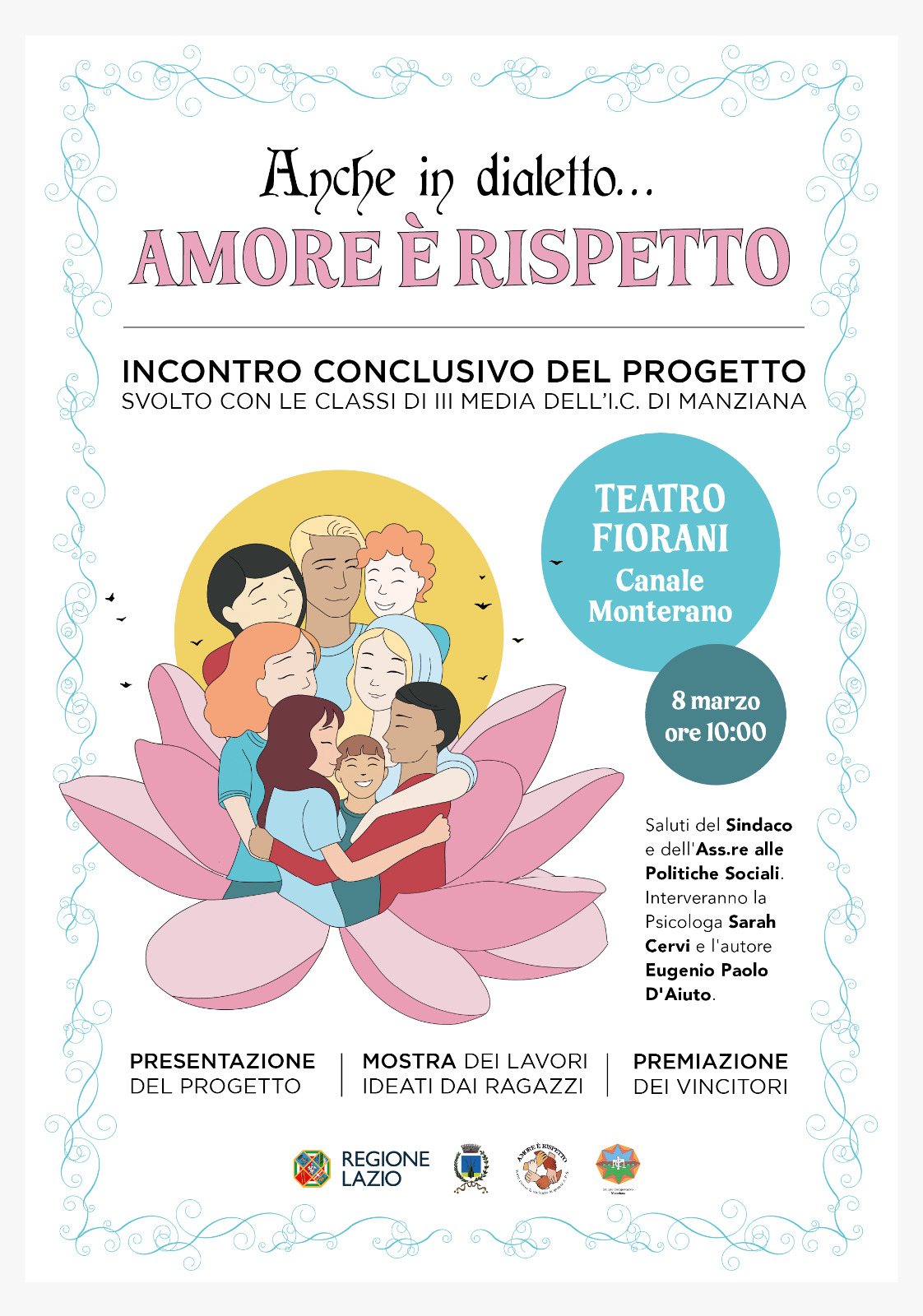 L’8 marzo alle ore 10:00, presso il Teatro Maurizio Fiorani di Canale Monterano, si terrà l’evento conclusivo di “Anche in dialetto… Amore è Rispetto”. Un progetto fortemente voluto dal Comune di Canale Monterano, finanziato dalla Regione Lazio e portato a compimento dall’Associazione “Amore è Rispetto – rete contro la violenza di genere”, dedicato ai ragazzi delle terze medie dell’Istituto Comprensivo Tommaso Tittoni.
