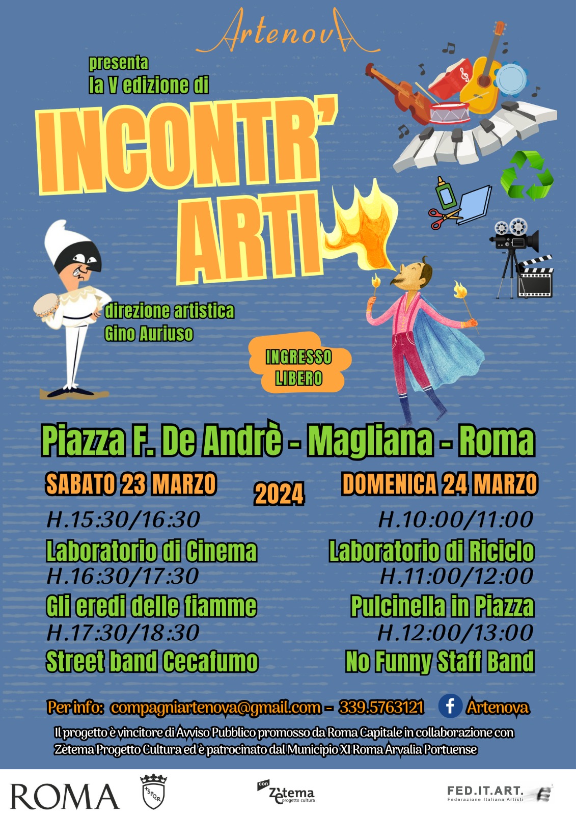 La manifestazione, con la direzione artistica di Gino Auriuso, verrà aperta sabato 23 marzo – in pomeriggio- da tre appuntamenti: laboratorio di cinema a cura dell’Associazione culturale Xenia; Gli Eredi delle Fiamme (spettacolo di fuoco) di e con Andrea Corvo; Concerto della Street Band Cecafumo e continuerà domenica 24 marzo la mattina con altri tre appuntamenti: Laboratorio Creativo di Riciclo a cura di Francesca Serpe; Pulcinella in Piazza (performance di Commedia dell’Arte) di e con Eduardo Ricciardelli; Concerto dei No Funny Stuff.