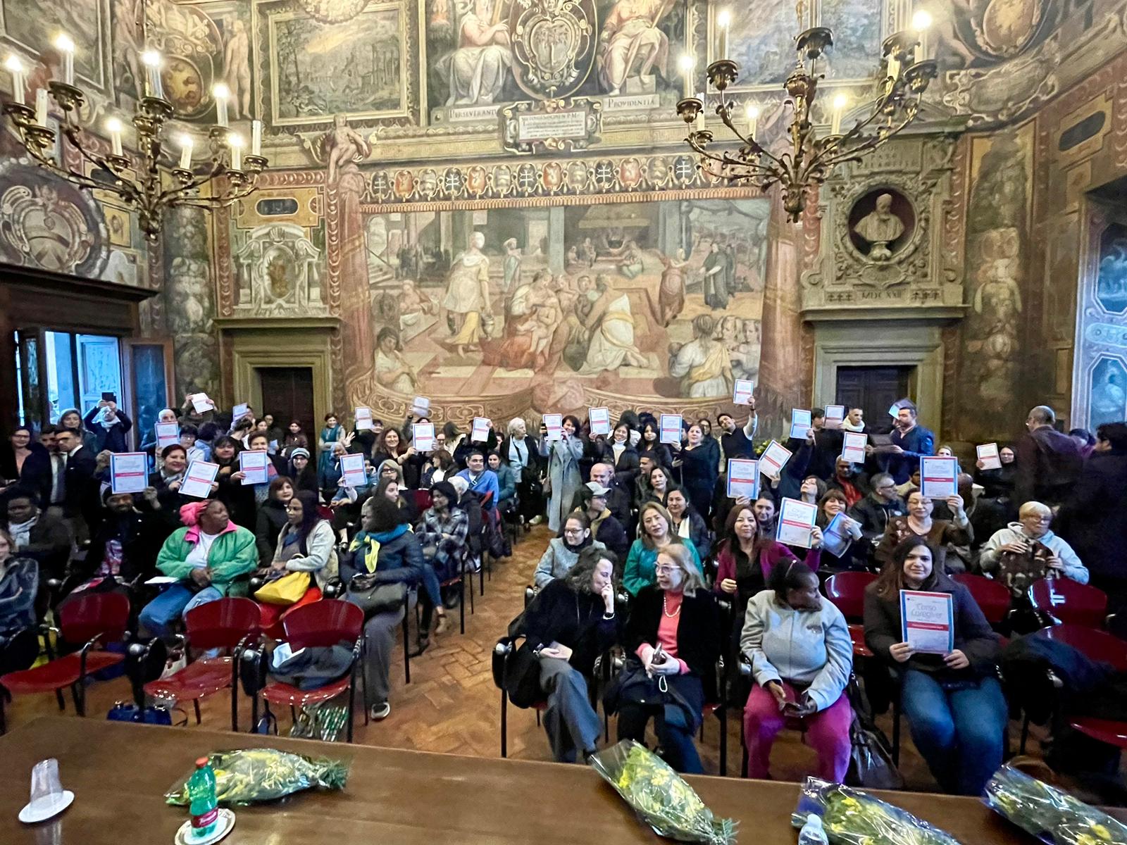 Si è tenuta nel Salone del Commendatore del Complesso Monumentale di Santo Spirito in Sassia la cerimonia di consegna dei diplomi del Corso per Caregiver. Si tratta di 53 persone, per lo più donne italiane e straniere, provenienti da ben 25 Paesi. Il Corso, completamente gratuito e promosso dalla ASL Roma 1 e dalla Comunità di Sant’Egidio, ha alternato lezioni e ore di tirocinio tra l’ospedale Santo Spirito, la Scuola di lingua e cultura italiana e i servizi rivolti alla popolazione anziana della Comunità di Sant’Egidio, permettendo ai suoi frequentanti di acquisire le capacità necessarie per assistere bambini piccoli, persone con disabilità, anziani non o parzialmente autosufficienti.