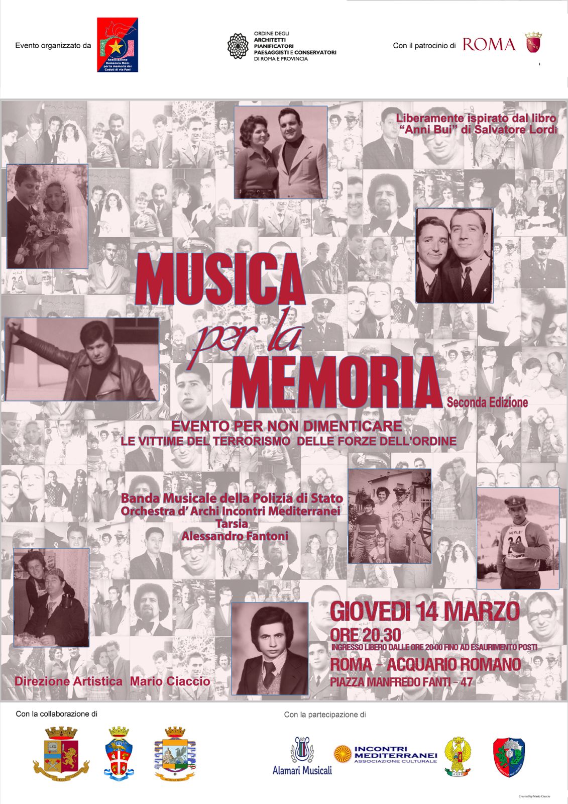 L’obiettivo è quello di trasformare la giornata da un momento tragico e luttuoso per tutta l’Italia a un giorno lieto e di speranza. La serata, che si inserisce tra le iniziative ufficiali per la rievocazione di questa importante ricorrenza, mette in scena una singolare fusione tra la Banda Musicale della Polizia di Stato e i racconti dei familiari delle vittime delle Forze dell’Ordine uccise dal terrorismo. Grazie al libro “Anni Bui. Storie sconosciute di uomini in divisa ammazzati dal Terrorismo, dal 1956 al 1980”, scritto da Salvatore Lordi (che racconta, in una sorta di diario, le vite intime e familiari di mogli, figli, fratelli dei tanti poliziotti, carabinieri e finanzieri ammazzati per mano dei terroristi), la Banda Musicale della Polizia di Stato musicherà per l’occasione i brani che furono il “life motive” di uno scampolo di vita che costoro vissero insieme. Lo scopo è di restituire a questi uomini delle Forze dell’Ordine, ricordati fino a ora nelle commemorazioni ufficiali, un’altra immagine: quella più intima e familiare dove proprio la musica fu riferimento di un fugace momento di vita. “Musica per la Memoria” intende aprire una pagina diversa nella storia dell’Italia per continuare a dare voce agli uomini in divisa caduti diversa nella storia dell’Italia per continuare a dare voce agli uomini in divisa caduti per salvaguardare le Istituzioni democratiche della Nazione.