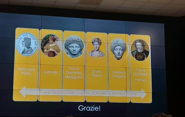 E ancora, dagli studi sulle immagini ritrovate nelle tombe etrusche emerge una donna bella e libera, che godeva dei piaceri della vita, partecipava ai banchetti. Donne sportive con il cappellino (tutulus) che assistono alla corsa delle bighe. Una donna allo specchio, una con i capelli biondi. Donne sempre più curate, con orecchini a disco, a grappolo, corone in lamina d’oro e bracciali. La donna era protagonista e a volte sapeva anche leggere e scrivere. Si pensi anche all’ideale della donna romana che la voleva “lanifica, pia, casta e dedita alla casa”. Gerarchicamente inferiore all’uomo era definita tramite il nome di un uomo come moglie di, madre di, figlia di. La donna ideale dei romani antichi era appunto Cornelia, conosciuta come madre dei Gracchi.  Se ci fermiamo a questo stereotipo gerarchico avremo difficoltà a comprendere che esistevano donne “imprenditrici”, “immobiliariste”. Livia Drusilla, moglie dell’imperatore Augusto, e molte altre donne commerciavano in materiali da costruzione; Rutilia Pollo comprò il lago di Anguillara e uno spazio di dieci metri intorno al lago. C’era chi vendeva lotti di terreno per costruire sepolcri, chi era parrucchiera (ornatrix), chi vendeva tessuti preziosi in una bottega sulla via Sacra. A Vicarello l’imperatore Domiziano possedeva una villa, si citano le sue donne dalle mogli, Giulia di Tito e Domizia Longina, alla nonna Vespasia Polla, alla madre Flavia Domitilla maggiore. Appaiono esempi di donne operose, che raggiunsero l’autonomia economica, che si mostravano con acconciature composte da riccioli fatti a ferro caldo, con aggiunta di toupet ed una fascia frontale, utile a contenere gli spilloni per reggere le trecce sistemate a torre dalle ornatrix. L’acconciatura indicava il ruolo, l’età, l’incarico, il ceto economico, il potere, l’identità e l’adesione a un modello femminile. Le donne della gens Flavia ebbero la loro effigie sulle monete.