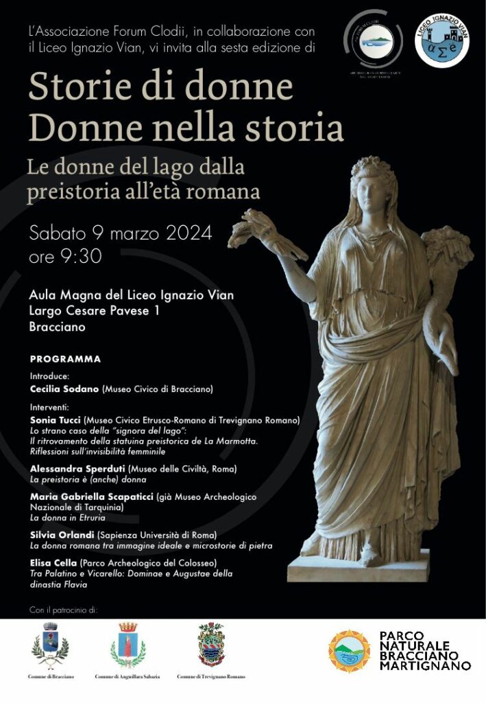 Nell’aula Magna del Liceo I. Vian, il 9 marzo 2024, la dottoressa Cinzia Caccia ha aperto il convegno dell’Associazione Forum Clodii di Bracciano, giunto alla sesta edizione. Con “Storie di donne. Donne nella storia”, si pone un focus sulle donne del nostro lago, dalla preistoria all’età romana. L’Associazione Forum Clodii – di cui la dottoressa Caccia è Segretaria – si interessa da un cinquantennio di arte, storia, patrimonio culturale di Bracciano e del nostro territorio. Un discorso introduttivo ricco di aneddoti -il Suo- da cui emerge l’orgoglio che il nostro lago conservi reperti paleolitici datati 10 secoli antecedenti a quelli famosi ritrovati sul lago di Garda. La stessa ritiene sia grande fonte di soddisfazione declinare al femminile una storia che continua, parlandone ai liceali che sono il nostro presente e il nostro futuro.