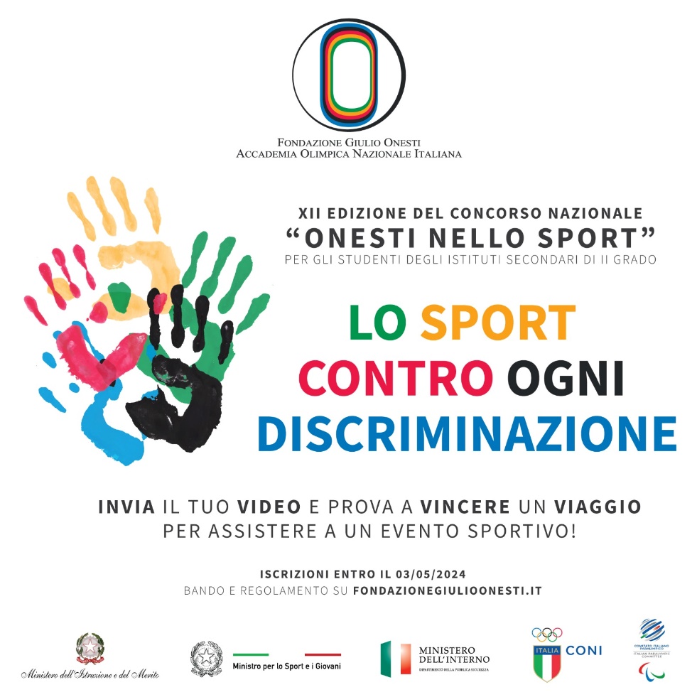 Torna “Onesti nello Sport”, concorso nazionale rivolto a studentesse e studenti degli Istituti secondari di II grado, con l’obiettivo di diffondere la cultura alla legalità in ambito sportivo, valorizzando lo sport come strumento d’inclusione e coesione sociale. Il tema della XII edizione sarà “Lo sport contro ogni discriminazione”. Il concorso è promosso dalla Fondazione Giulio Onesti e dal CONI, in collaborazione con il Ministero dell’Istruzione e del Merito, il Ministro per lo Sport e i Giovani – attraverso il Dipartimento per lo Sport della Presidenza del Consiglio dei Ministri – e il Dipartimento della Pubblica Sicurezza del Ministero dell’Interno, con il sostegno del Comitato Italiano Paralimpico. Gli studenti potranno partecipare inviando i loro video, nei quali includere anche uno slogan che sintetizzi il tema trattato. Il premio di questa edizione consiste nella partecipazione al Golden Gala Pietro Mennea, evento della Diamond League di atletica  leggera che si svolgerà il 30 agosto allo Stadio Olimpico di Roma, che comprende anche il viaggio con soggiorno.