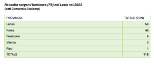 Per quanto riguarda le sorgenti luminose, storico raggruppamento gestito dal consorzio, nel 2024 il Lazio ne ha avviate a riciclo 116 tonnellate. In particolare, la provincia di Latina ha raccolto 58 tonnellate, confermandosi terza provincia in Italia per raccolta. Seguono Roma con 48 tonnellate, Frosinone (6), Viterbo (3) e Rieti (1).