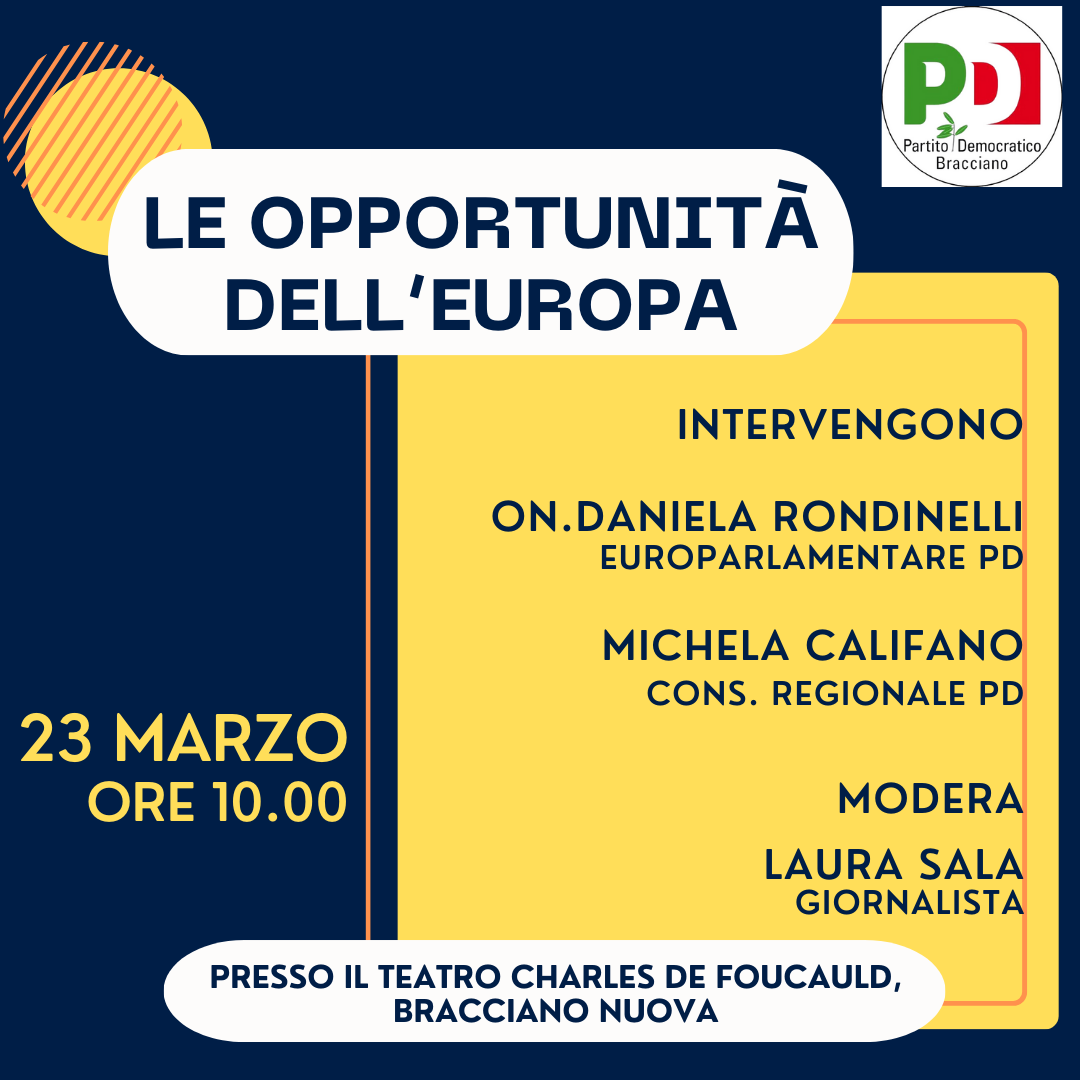 L’Europa non è solo un continente, ma un’idea, un progetto in continua evoluzione che ci invita a guardare avanti con fiducia. Il 23 marzo, alle ore 10 presso il Teatro Charles de Foucauld, sito in Bracciano 2, avremo l’occasione di riflettere insieme sulle innumerevoli opportunità che l’Europa ci offre.