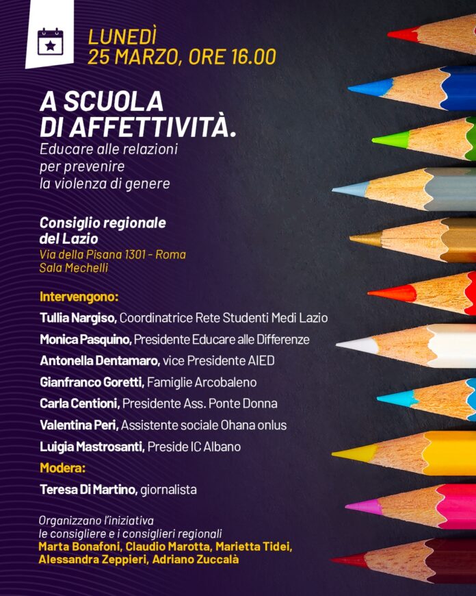 Si terrà lunedì 25 marzo prossimo nella Sala Mechelli del Consiglio Regionale del Lazio l’incontro “A scuola di affettività. Educare alle relazioni per prevenire la violenza di genere” organizzato dalle consigliere e consiglieri regionali Marta Bonafoni, Claudio Marotta, Marietta Tidei, Alessandra Zeppieri, Adriano Zuccalà.