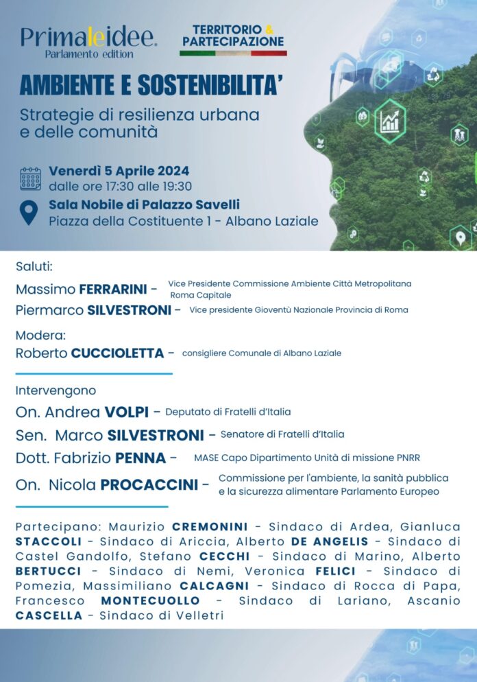 “Ambiente e Sostenibilità, strategie di resilienza urbana e delle comunità” è questo il titolo dell’evento promosso da “PrimaLeIdee – Parlamento Edition” e da “Territorio e Partecipazione” che si terrà Venerdì 5 Aprile 2024 presso la Sala Nobile di Palazzo Savelli ad Albano Laziale. Un momento di incontro e confronto tra diversi livelli istituzionali sui temi cruciali legati alla sostenibilità ambientale e alla resilienza delle comunità urbane, con particolare attenzione rivolta alle realtà della Provincia di Roma.